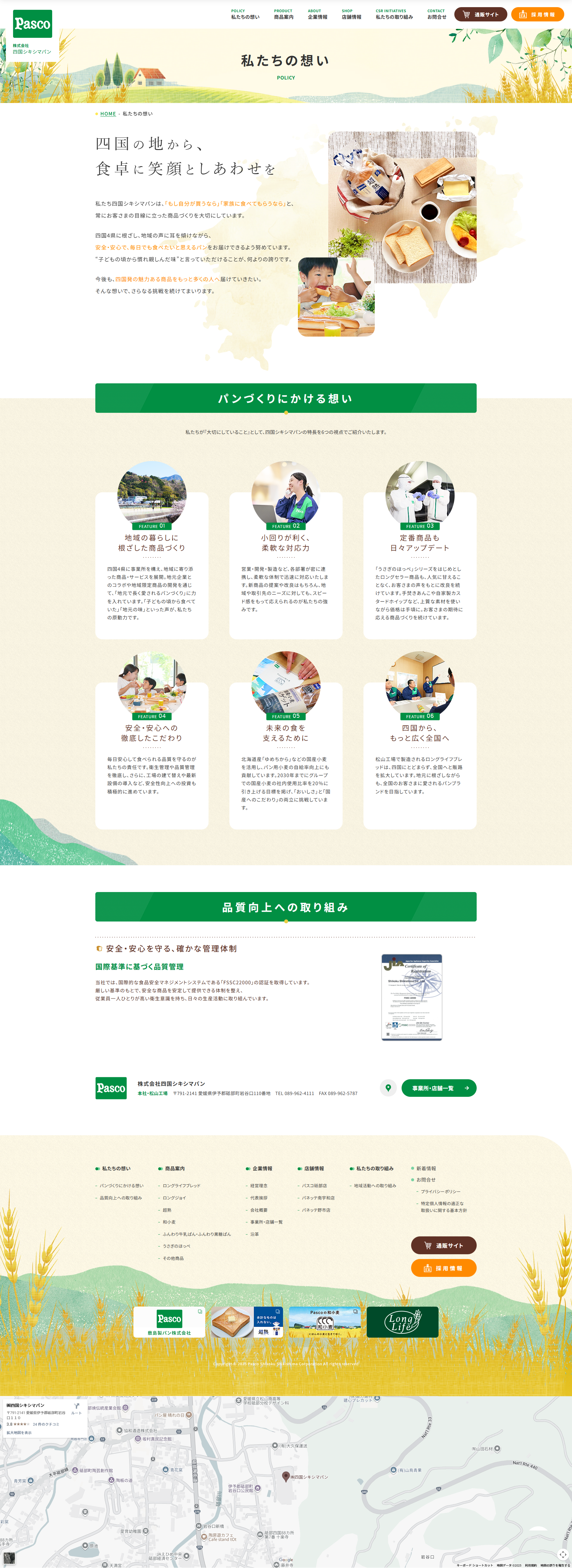 コーポレートサイトでは、企業の信頼感や誠実な取り組みがしっかりと伝わるように、落ち着いたトーンとやさしい色合いでまとめ、パンづくりに対する誠実な姿勢と地域とのつながりを、サイトを訪れる方が自然と感じ取れるよう工夫しました。
